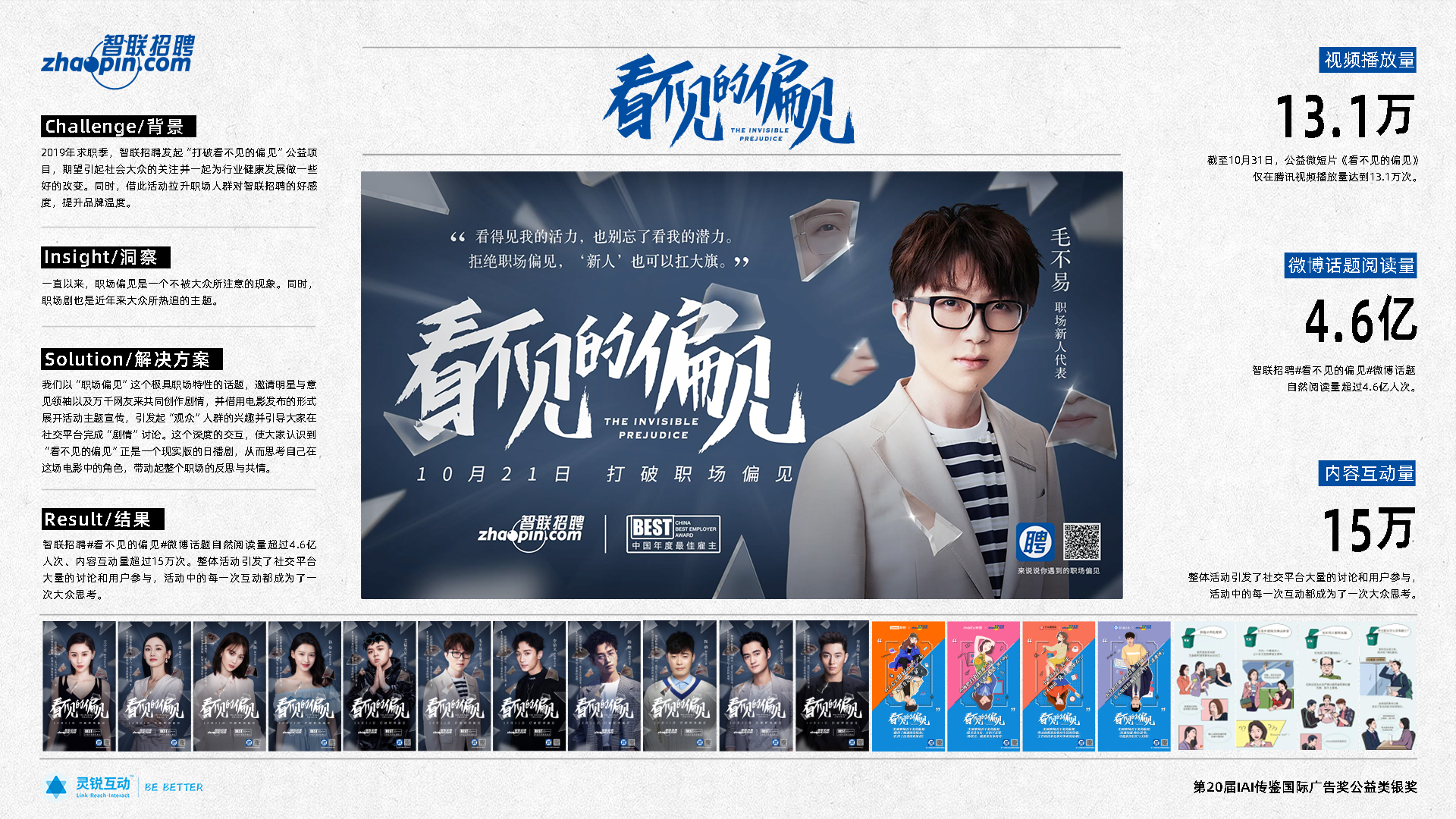 - 2019年(nián)求職季,智聯招聘發起“打破看(kàn)不(bù)見(jiàn)的(de)偏見(jiàn)”公益項目,期望引起社會(huì)大(dà)衆的(de)關注并一(yī)起為(wèi)行(xíng)業(yè)健康發展做(zuò)一(yī)些(xiē)好(hǎo)的(de)改變。同時(shí),借此活動拉升職場(chǎng)人(rén)群對(duì)智聯招聘的(de)好(hǎo)感度,提升品牌溫度。
