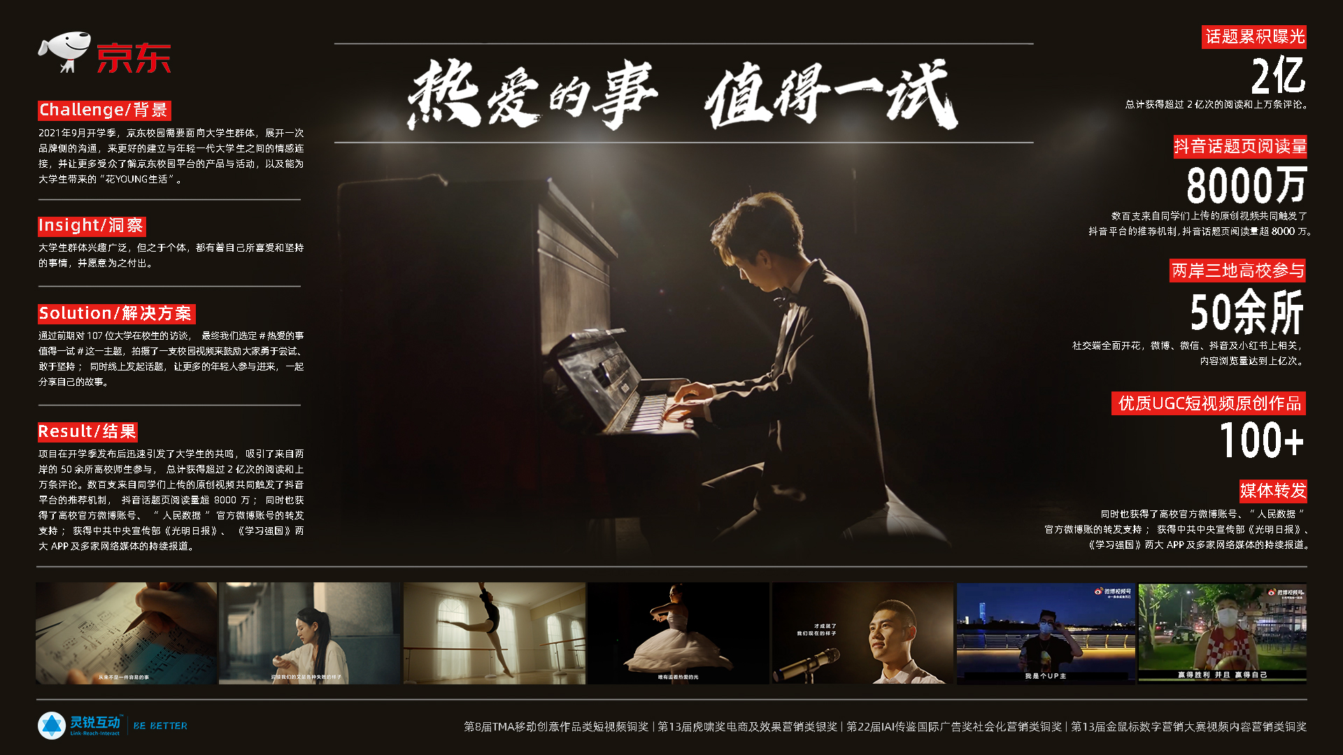 - 通(tōng)過前期對(duì)107位大(dà)學在校(xiào)生(shēng)的(de)訪談,最終我們選定#熱(rè)愛(ài)的(de)事(shì) 值得(de)一(yī)試#這(zhè)一(yī)主題,拍(pāi)攝了(le)一(yī)支校(xiào)園視(shì)頻(pín)來(lái)鼓勵大(dà)家(jiā)勇于嘗試、敢于堅持;同時(shí)線上(shàng)發起話(huà)題,讓更多(duō)的(de)年(nián)輕人(rén)參與進來(lái),一(yī)起分(fēn)享自(zì)己的(de)故事(shì)。