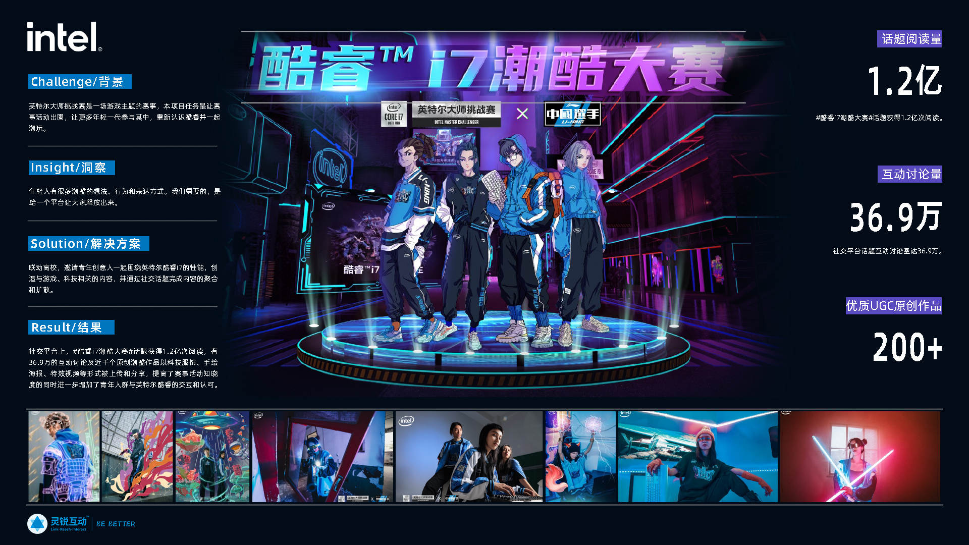 - 社交平台上(shàng),#酷睿i7潮酷大(dà)賽#話(huà)題獲得(de)1.2億次閱讀(dú),有(yǒu)36.9萬的(de)互動討(tǎo)論及上(shàng)百個(gè)原創潮酷作(zuò)品,以科(kē)技(jì)服飾、手繪海(hǎi)報(bào)、特效視(shì)頻(pín)等形式被上(shàng)傳和(hé)分(fēn)享,提高(gāo)了(le)賽事(shì)活動知(zhī)曉度的(de)同時(shí)進一(yī)步增加了(le)青年(nián)人(rén)群與英特爾酷睿的(de)交互和(hé)認可(kě)。